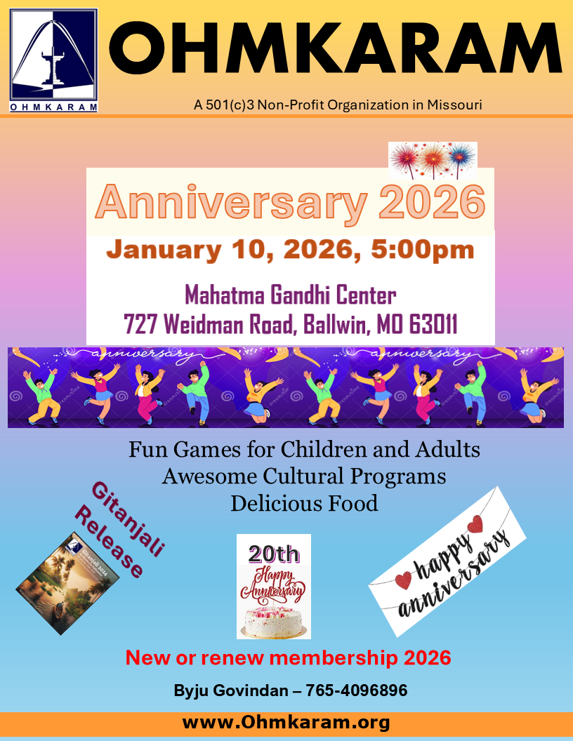 For more information contact President Byju Govindan 765-409-6896 or email us at info@ohmkaram.org